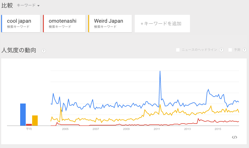 Un petit tour sur Google trend est assez révélateur: Cool Japan (le programme officiel) est devant Weird Japan (recense tous les campagnes marketing d’entreprise essayant de se différencier, une fois traduites en anglais) et loin devant omotenashi, cette qualité de service a la Japonaise (a tel point que, depuis que c’est devenu un mot a la mode en 2014, tout le monde a besoin d’une formation pour savoir comment faire).