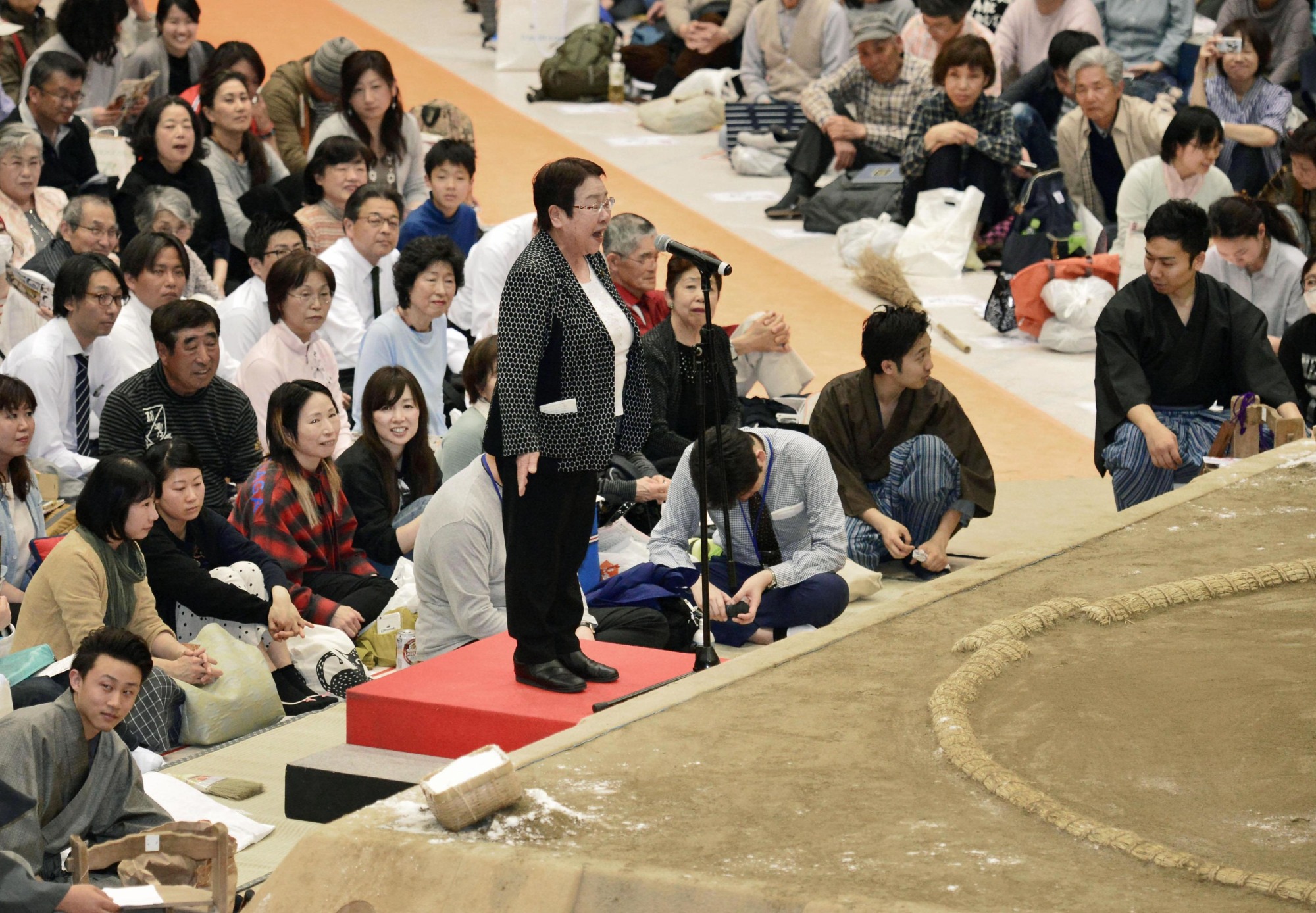 Le lendemain, la maire d’une autre ville devait faire un discours d’ouverture d’une compétition de sumo. Sur un petite estrade improvisée. En dehors de l’arène.