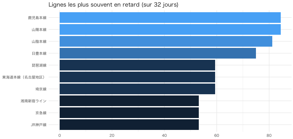 J’ai retiré quatre lignes qui étaient complètement à l’arrêt sur l’ensemble de la période. Etonnamment, quand on regarde l’ensemble du Japon, les lignes les plus en retard ne sont pas sur Tokyo.