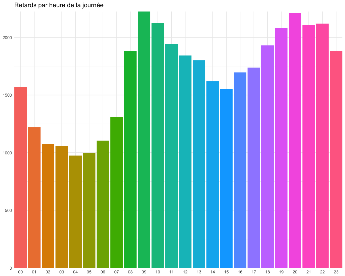 Bizarrement, l’après midi semble cumuler beaucoup plus de retards que ce à quoi je m’attendais. D’un autre côté, c’est aussi la plage horaire la plus longue. Donc pour corriger ça, regardons directement par heure :