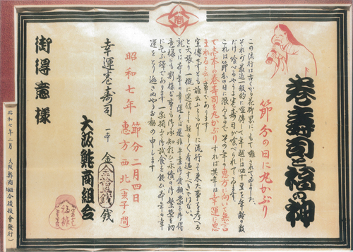 Et jusqu’en 1955, aucune mention d’une direction particulière vers laquelle le manger. Ce qui, pour un plat dont le nom signifie littéralement « rouleau [a manger vers] la direction favorable », est quelque peu gênant. C’est pour ça que sur cette affiche de 1932, on parle de jushi maki (rouleau de longue vie)