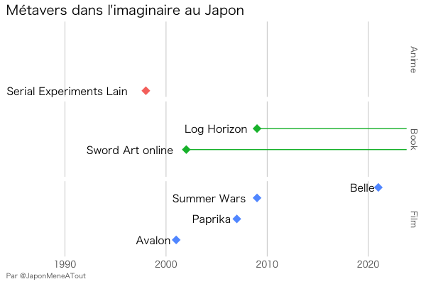 Dur de parler du Métavers au Japon sans commencer par Serial Experiments Lain qui est un peu le précurseur dans le domaine, le premier animé a aborder le sujet d’un Métavers (nommé Wired) en 1998. On retrouve énormément des thèmes de Snow Crash : fusion entre réel et virtuel, drogue, religion, détournement de la technologie au profit d’une minorité… Mais aussi un élément qui reviendra plus tard, la communication comme élément important du multivers, ici mise en contraste avec un monde réel ou la communication est complètement inexistante.