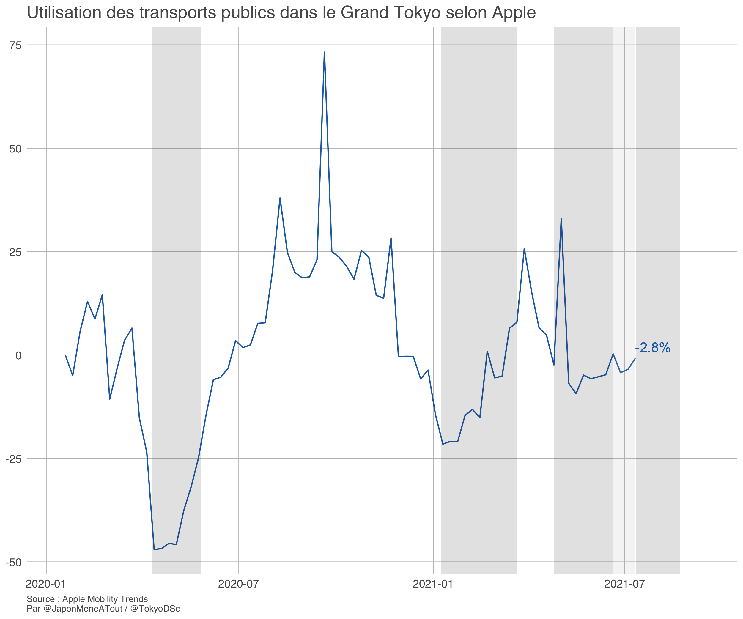 Pour comparer, voici les données de mobilité collectées par Apple pour la zone urbaine de Tokyo (Tokyo, Kanagawa, Saitama et Chiba) et qui dépeignent un histoire bien différente.