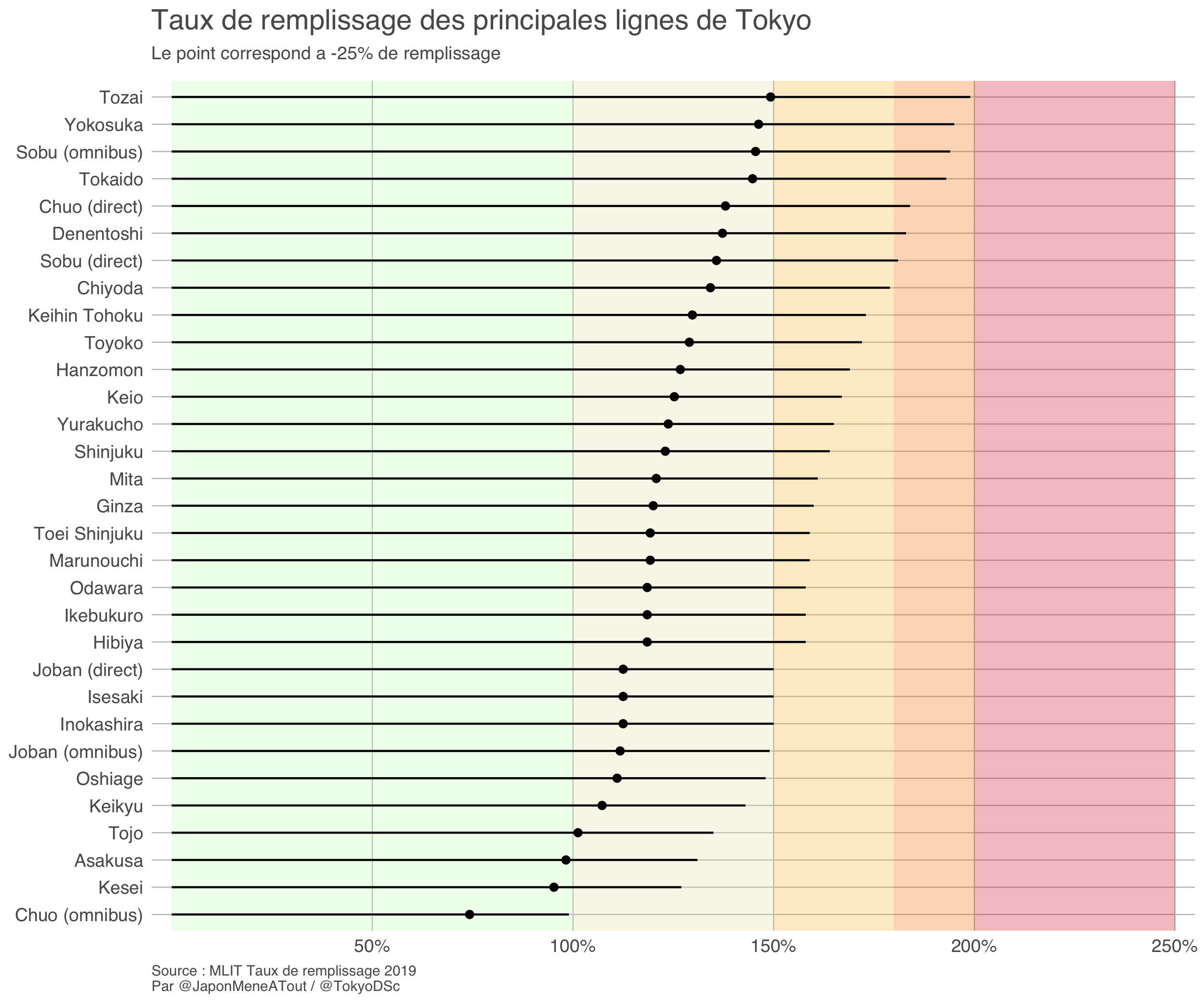 Le même Ministère en charge des transport fournit également le taux de remplissage a l’heure de pointe des différentes lignes en 2019, ici coloré avec les mêmes taux de remplissage que la définition du MLIT. Ce qu’on peu donc facilement comparer aux annonces de la mairie de Tokyo